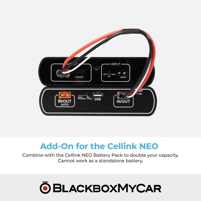 The Cellink NEO Extended battery is ideal for users who are not getting enough parking mode recording from a base battery pack, allowing for a simple addition to the existing battery, being daisy-chained to the existing battery, providing an additional 6'800 mAh.Looking to extend parking mode even further? Multiple Extended battery packs can be daisy-chained together with no issue!