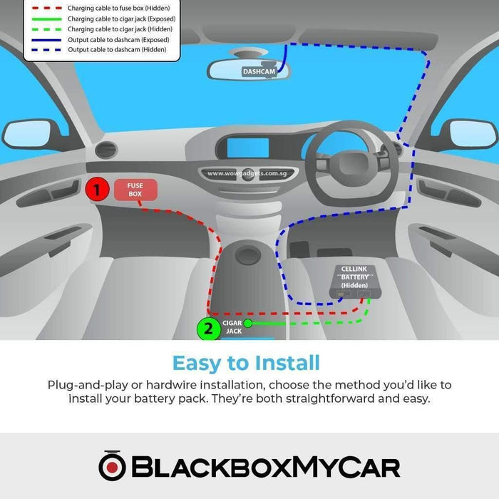 If you already have a three wire (B+, ACC, Ground) hardwire kit, you can splice it into the Cellink Battery B battery pack output yourself. This is a good option for the DIY-ers out there.