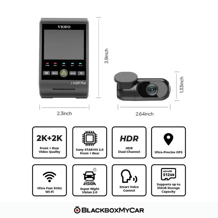 The VIOFO A229 Plus 2-Channel carries the most advanced Sony STARVIS 2.0, empowering both front and rear channels. Add in fresh features like Voice Controls, Dual-Band Wi-Fi, Quad-Module GPS, and up to 512 GB storage, this dash cam is the best budget-friendly dual-channel in its class.